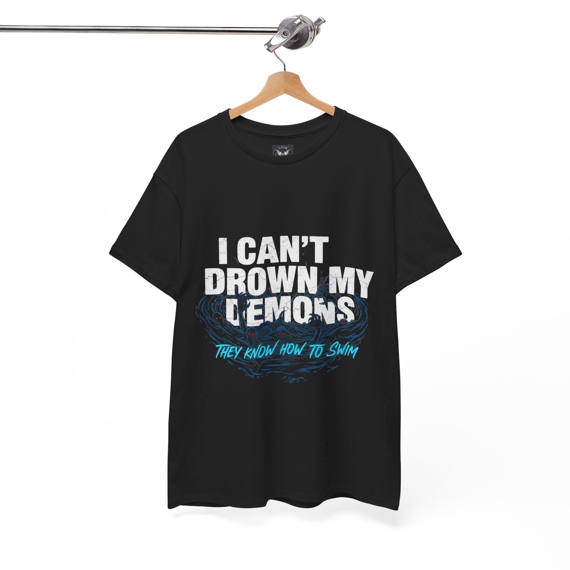 This lyric t-shirt featuring 'I can't drown my demons' is perfect for fans of Bring Me The Horizon (BMTH) or anyone who appreciates emo/punk rock music. The shirt exudes a dark and edgy vibe, making it suitable for casual wear or music concerts. Ideal for adults looking to express their love for music through their clothing. Great for fans celebrating music festivals or attending rock concerts.